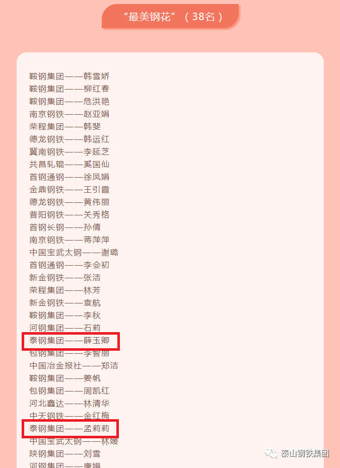 在钢铁行业中,有这样一群人:她们穿上工装,上到岗位,铁肩担当,以钢之坚强在平凡的岗位上创造辉煌;她们换上女儿装,化身倾听者、开导者,以花之美丽让生活充满阳光。她们有一个共同的名字,那就是——“钢花”。3月8日,由中国冶金报社官微冶金传媒特推出的“最美钢花”投票活动结果揭晓,泰山钢铁集团职工薛玉卿、孟莉莉光荣上榜“最美钢花”名单。