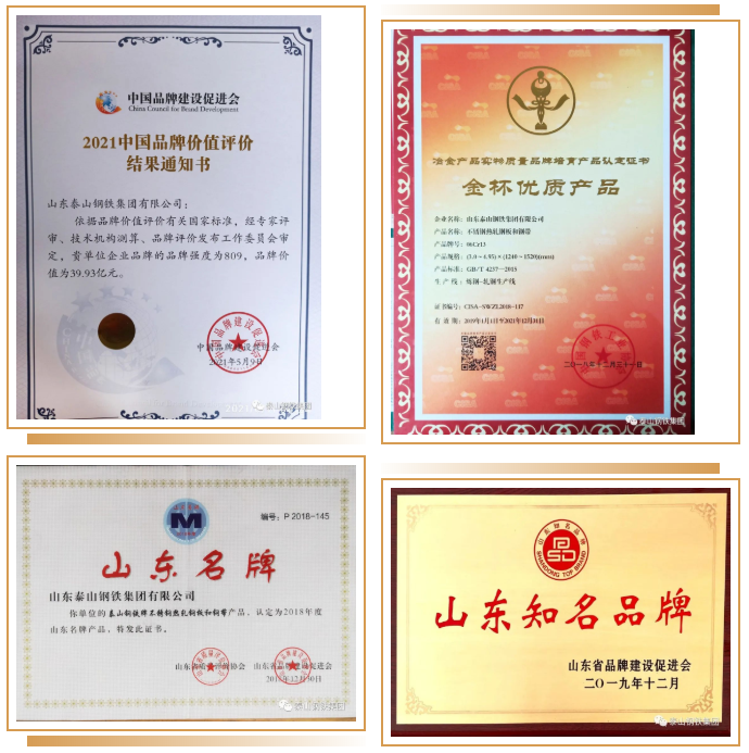在“2021中国品牌价值评价信息”中,泰山钢铁以品牌价值39.93亿元,强度809,位列冶金有色组第十三位,同时进入山东品牌价值评价榜单,先后被评为中国制造业“十佳品质”优秀企业、山东省民营企业品牌价值百强企业、山东省金属冶炼产业品牌10强企业、山东省高端品牌培育企业、山东省百年品牌重点培育企业等荣誉称号。06Cr13不锈钢热轧钢带被中国钢铁工业协会认定为冶金实物质量“金杯奖”,不锈钢热轧钢带被评为山东省名牌产品、山东省制造业单项冠军产品;不锈钢热轧钢带和冷轧钢带均被山东省品牌建设促进会授予“山东省知名品牌”荣誉称号。