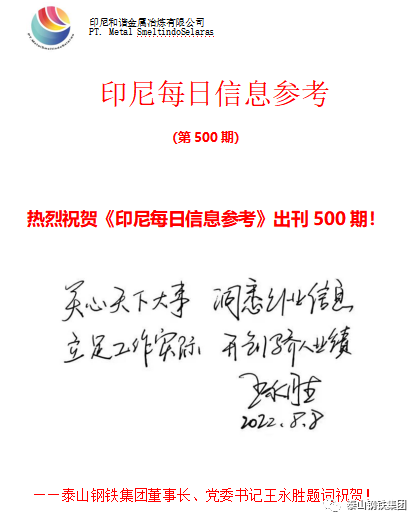 2022年8月,泰山钢铁集团海外期刊《印尼每日信息参考》迎来创刊500期。8日,集团董事长、党委书记王永胜题词“关心天下大事 洞悉行业信息 立足工作实际 开创骄人业绩”表示祝贺。