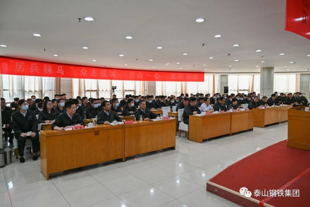 今天的会议室气氛隆重热烈。主席台上方是“泰山钢铁集团庆祝建党102周年暨精品钢绿色转型项目动员大会”会标,后方悬挂着条幅“厉兵秣马 众志成城 万众一心 勇攀高峰”。