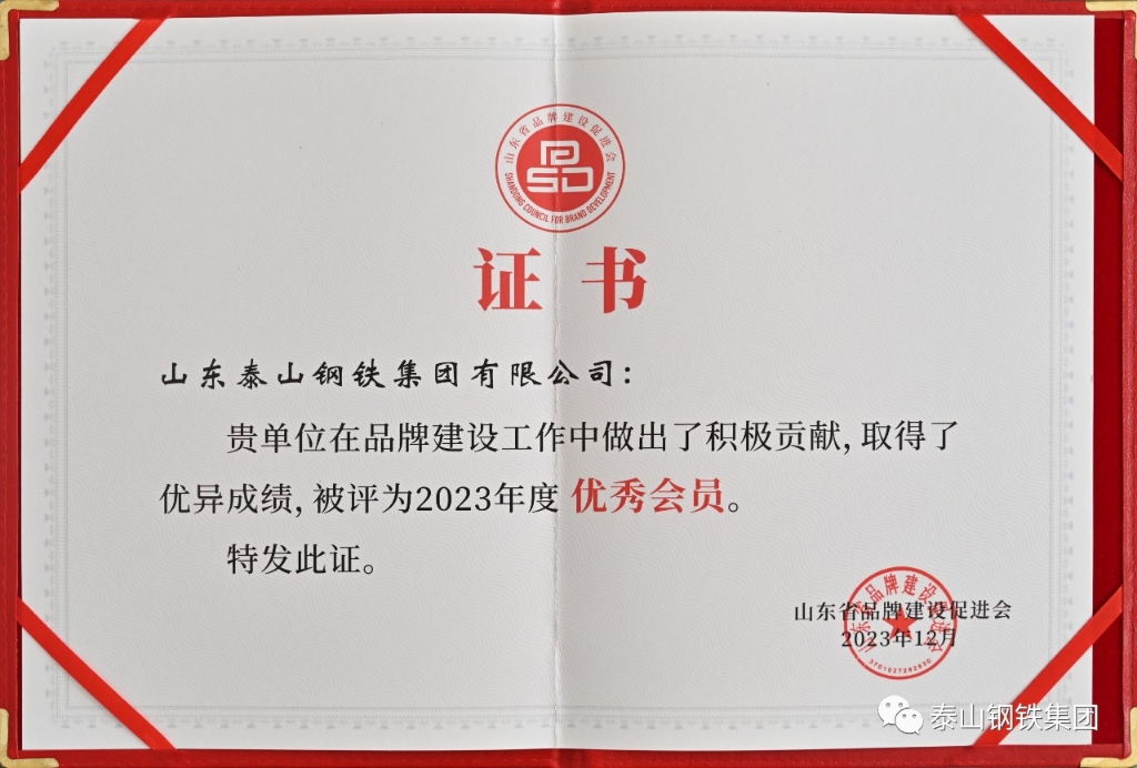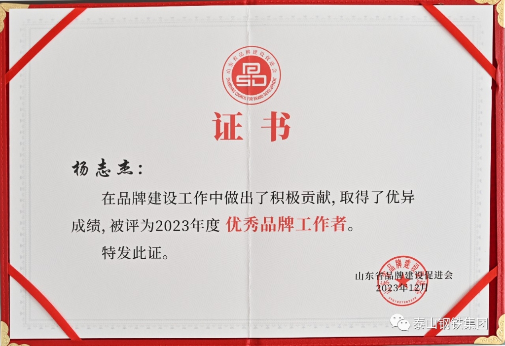 泰山钢铁集团被评为“山东省品牌建设优秀会员单位”,“江南(中国)品牌的创建和发展”被评为“品牌建设优秀案例”,职工杨志杰被评为“优秀品牌工作者”。